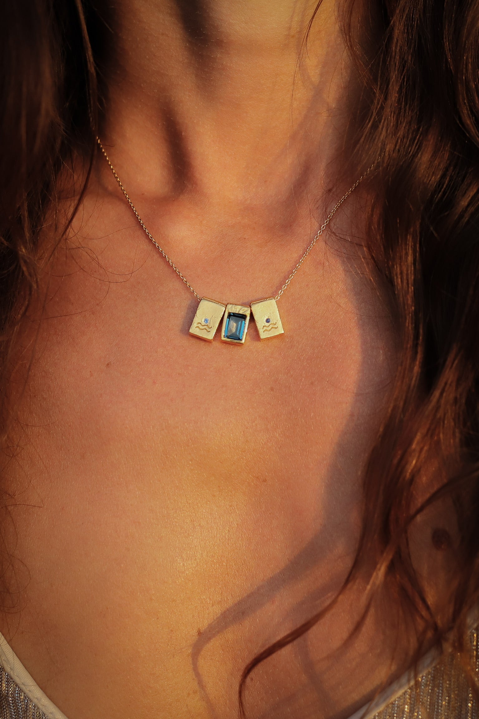 Une amulette sertie d’un saphir bleu. Gravée " mer " au dos, elle est à la fois chaleur et énergie.